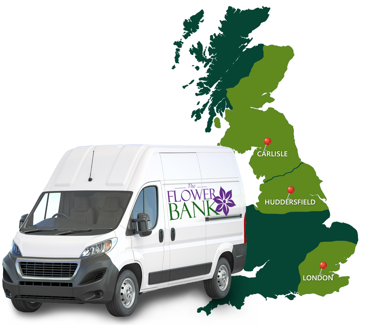 At The Flower Bank we deliver across the north of England and as far north as Aberdeen in Scotland. Our sister companies, based in Huddersfield and London, cover central England, London and the south east